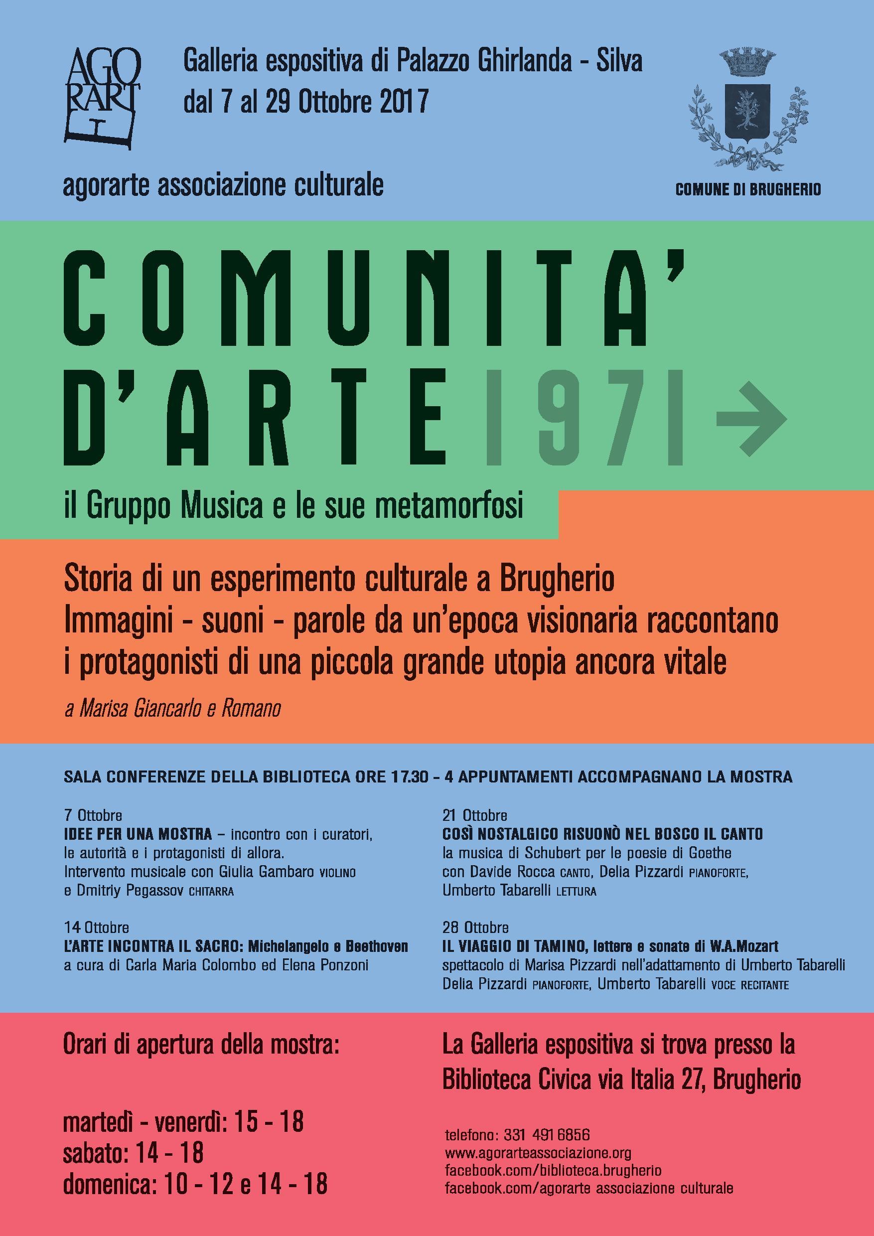 COMUNITA' D'ARTE 1971 ---> racconta la storia dalla quale AGORARTE stessa deriva, e con essa il ruolo fondamentale svolto da Delia Pizzardi, che è nostra Presidente Onoraria; segna un ritorno delle nostre attività a Brugherio, dove siamo nati; prepara con buoni auspici il trentennale dalla nostra fondazione.