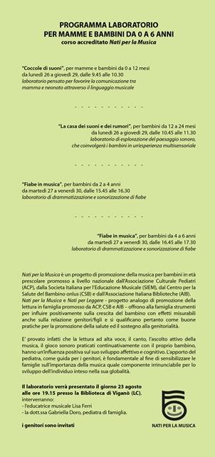 Domani 23 agosto 2013 alle 19.15 nella biblioteca di Viganò (LC) si terrà l'incontro di presentazione dei laboratori musicali per bambini da 0 a 6 anni, progetto accreditato dall'associazione nazionale "nati per la musica".