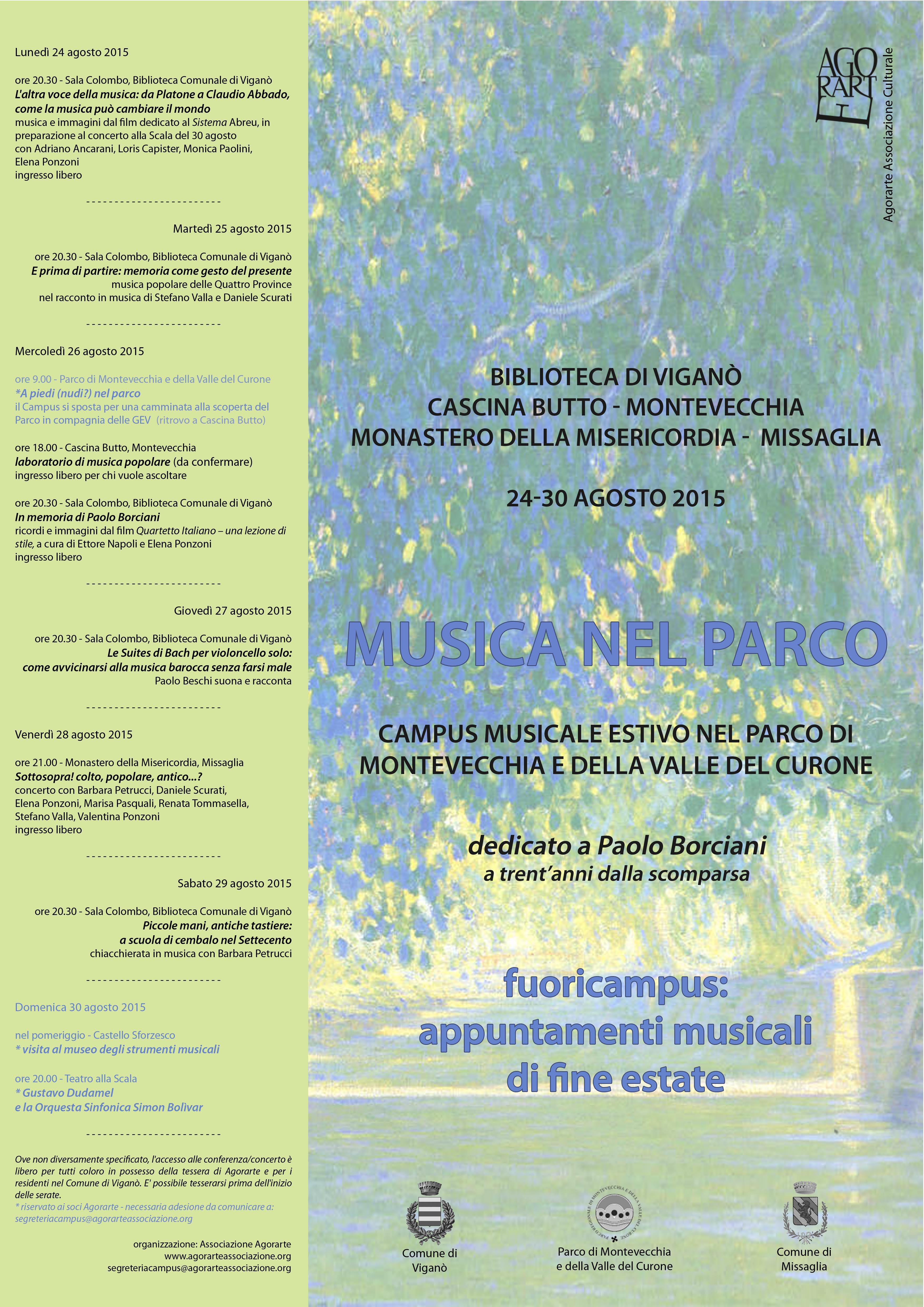 Ove non diversamente specificato, l'accesso alle conferenze/concerto è libero per tutti coloro in possesso della tessera di Agorarte e per i residenti nel Comune di Viganò. E' possibile tesserarsi direttamente prima dell'inizio delle serate.